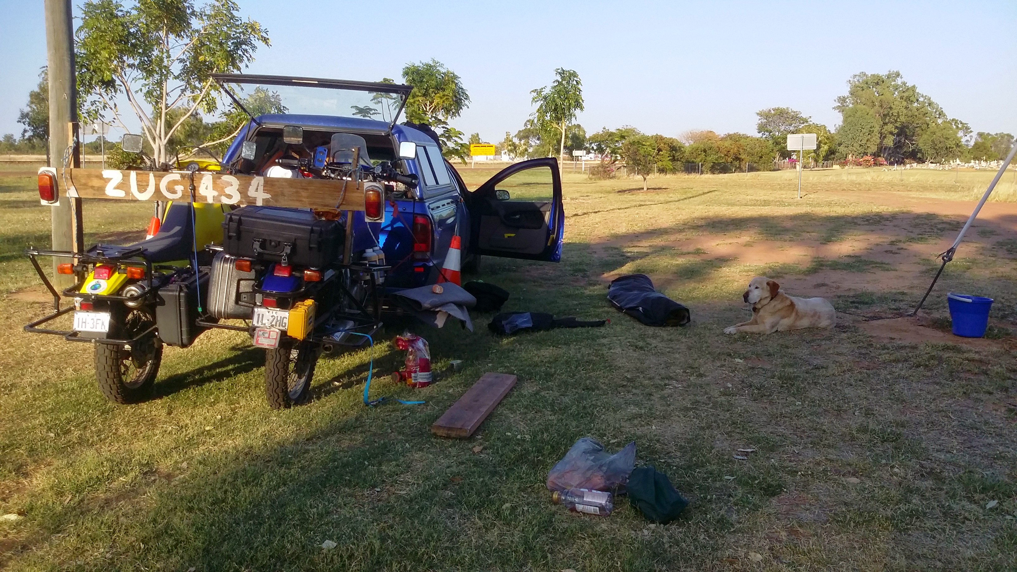 Because we had spent so much time preparing for our big RTW trip, neither of us had even thought about what route we would take to Camooweal, nearly 3000kms away. Towing an original Con invention, with the bikes on their rear wheels, we couldn’t reverse or do tight. turns. This coupled with having a dog in the back of the ute who couldn’t really get out without fuss and a lot of help made our start a little wobbly.