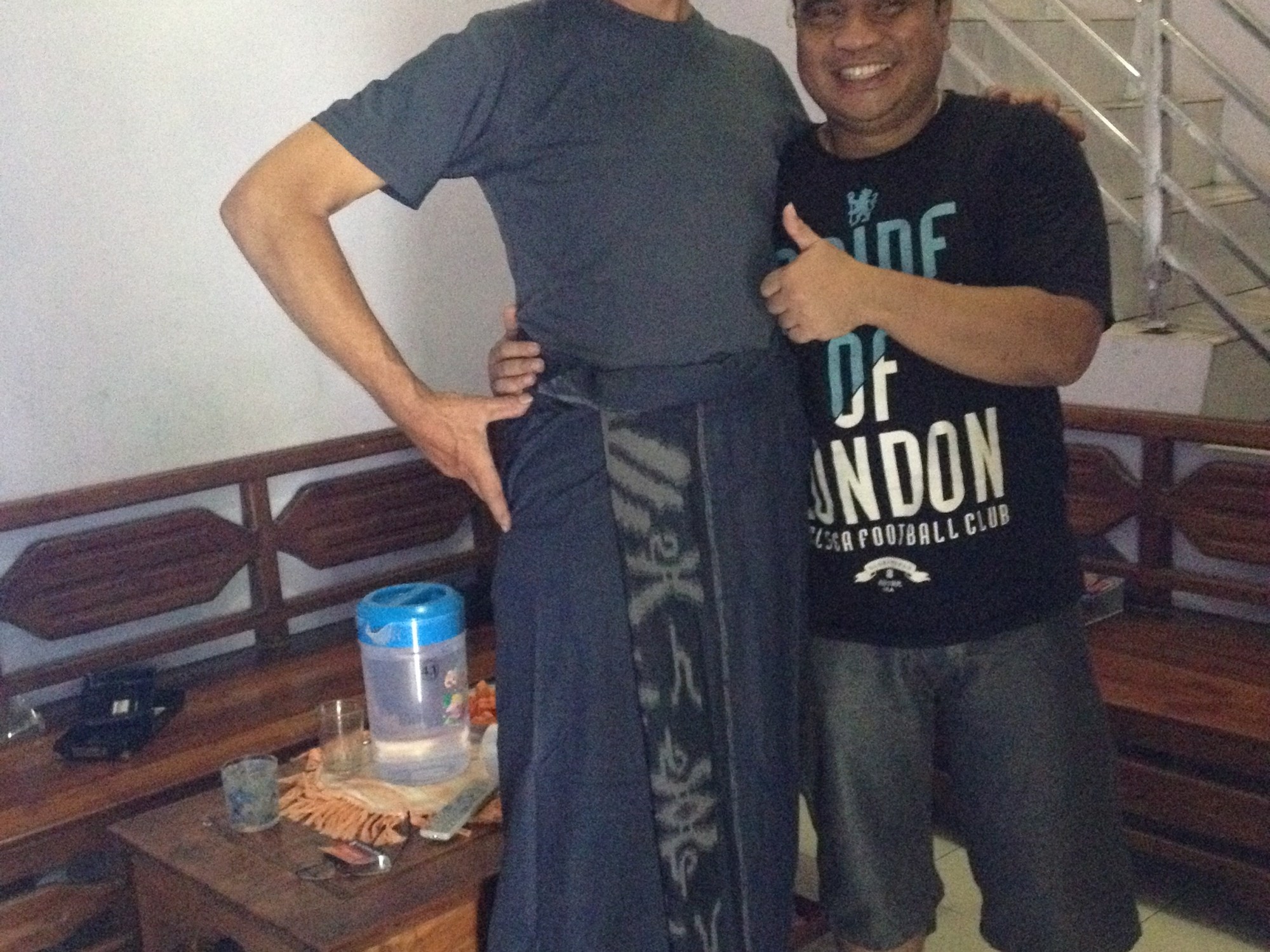 After what we thought was a polite period of time to stay, even though I was dreaming of sleeping in this beautiful house, we made moves to leave. Having only a ‘roostersoverland’ sticker to give him we presented one to him. In return, the man went to a cupboard and promptly brought out a box for Con. Inside the rather smart looking box was a sarong of beautiful quality. It was obviously one for a male and so Con politely put it on with the help of our new friend in tying it properly.