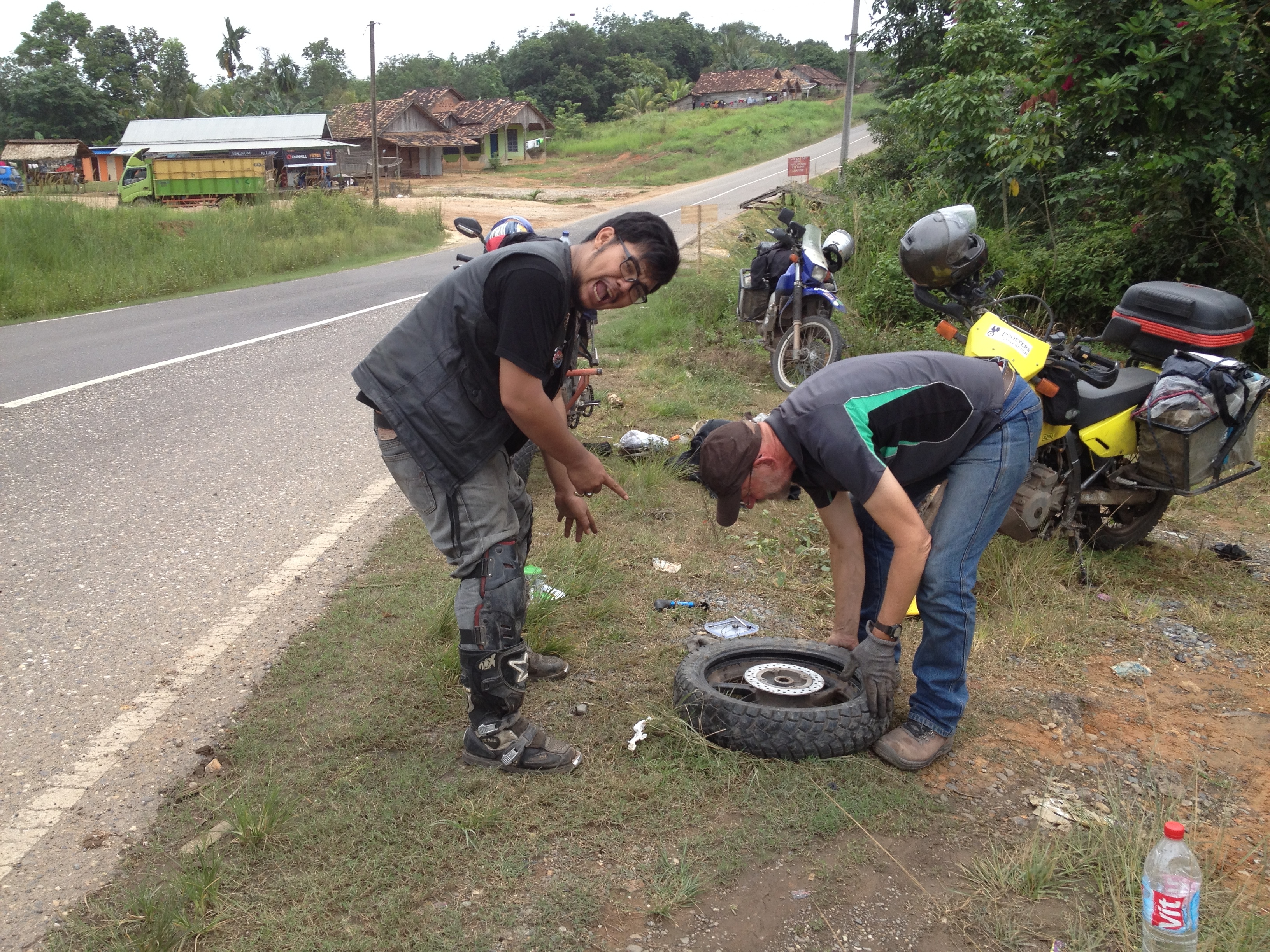 On our way towards Jambi travelling through palm oil plantation country, Sam had a rear flat. Luckily we were carrying a compatible spare tube and so we were happy to repay his kindness with the help of changing his flat and donating our spare tube to him. As always coffee was available across the road, so whilst Con changed the flat, I provided the coffee!