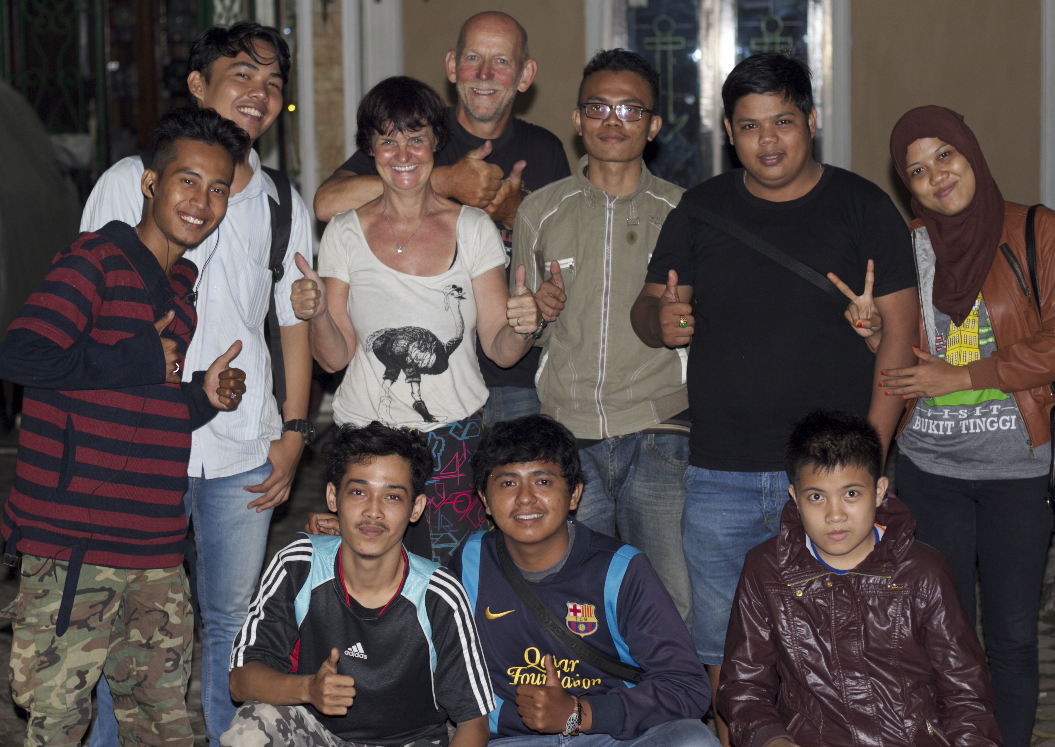 However, a night tour was on the agenda so after our free program day, we were picked up by an even larger group of bikers ready to escort us around the night sights. Pillion passengers we were for the night, collecting more bikers as we went, finally stopping for the best Sate in Sumatra and more photos and sticker swapping.