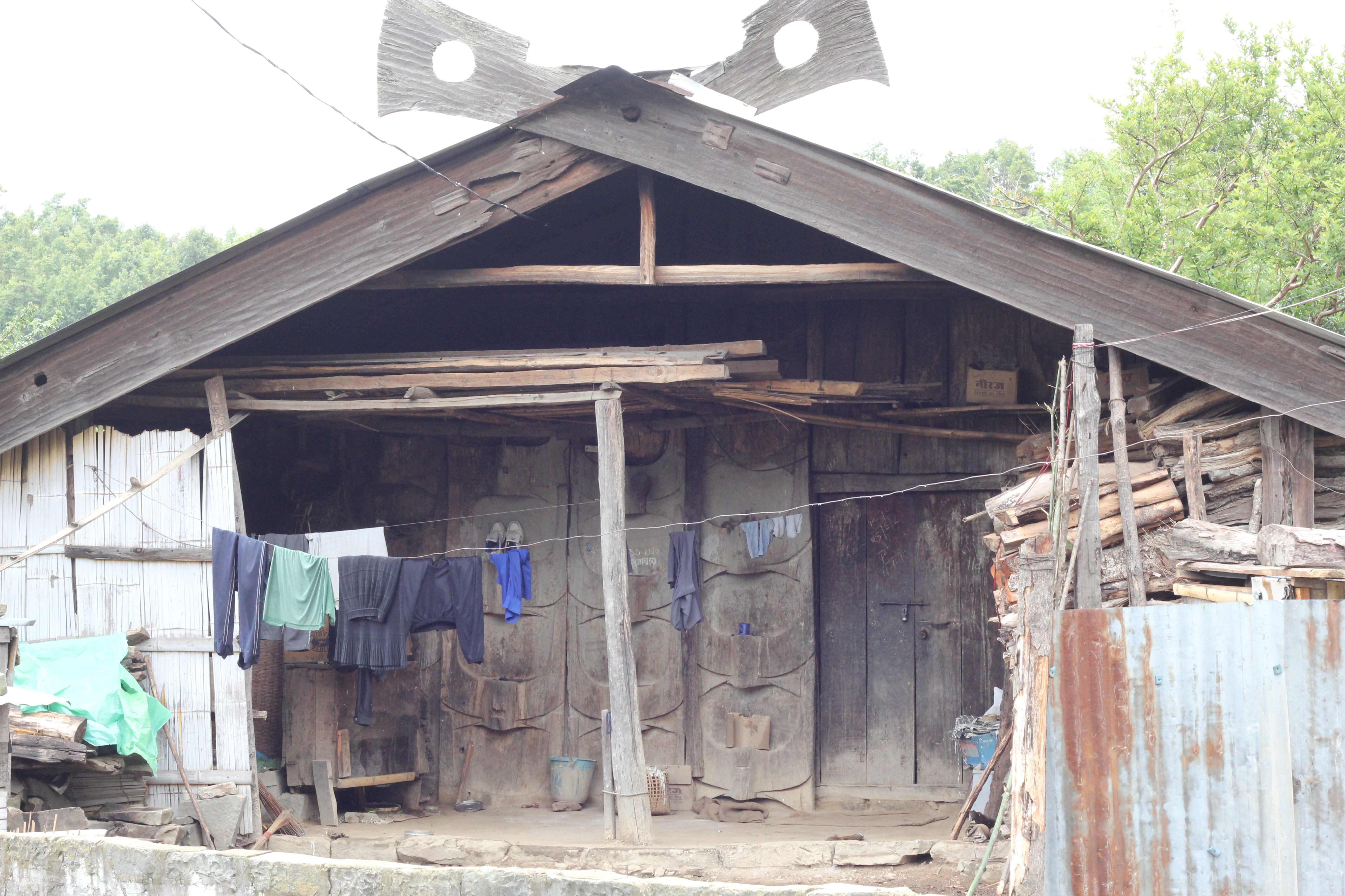 Along the way, there was a sign boasting of the highest village in Nagaland, so we thought we would drop in and have a ‘cuppa’. Down we dropped steeply into the village, passing by wooden houses with rooflines resembling buffalo horns under which were messy conglomerates of very large ‘ mitun’ (buffalo) horns nailed over the doorways. All of a sudden, on a corner of the road against a backdrop of an amazing vista of mountains, stood a tattooed red cloaked man holding a spear! My research showed that the headhunters were not supposed to be in existence anymore! Hurriedly, we rode past him, still looking for a Rice Hotel until we reached a dead end and a courtyard of these incredible wooden houses and horned doorways. We weren’t sure we should be here!