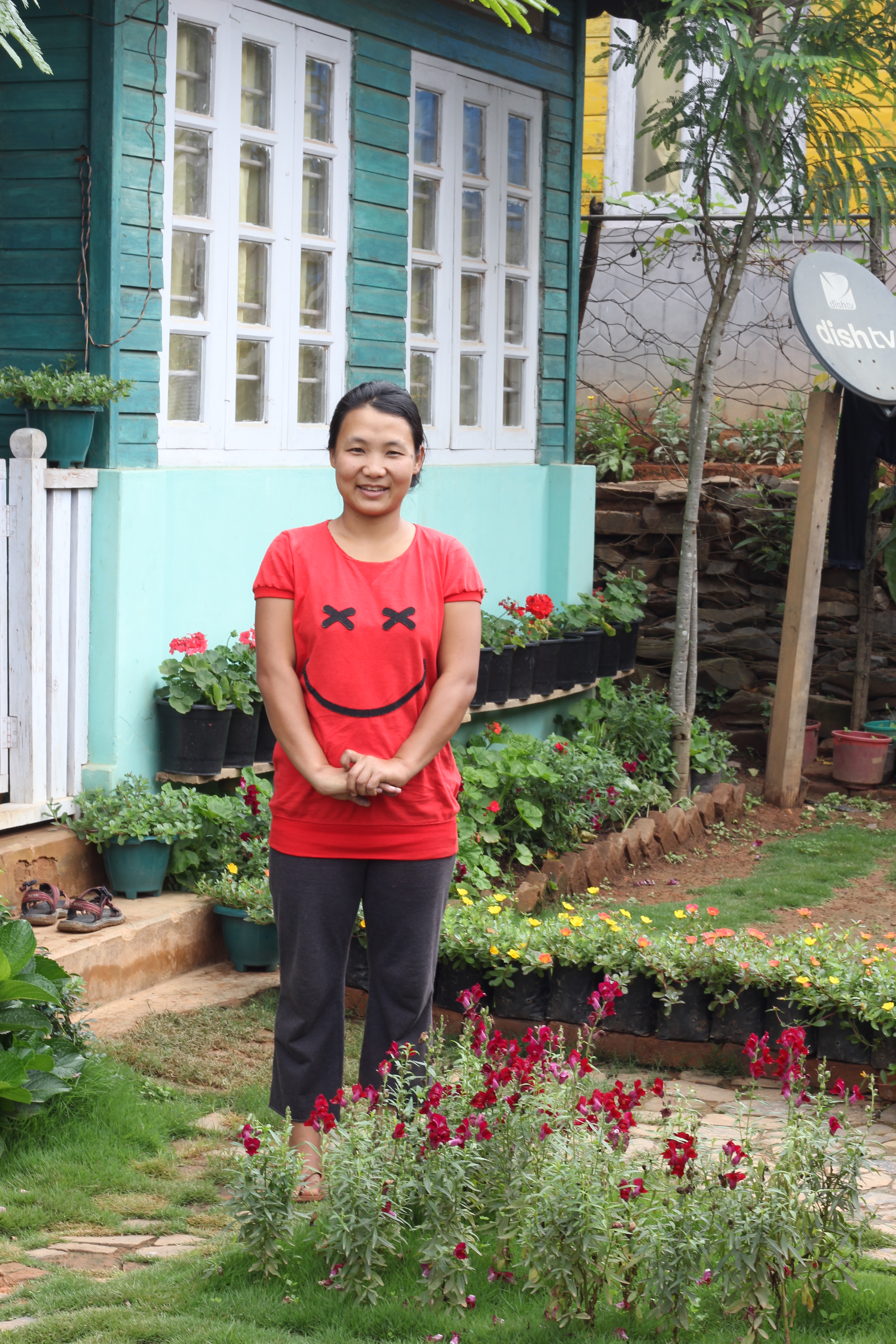 A young man soon appeared under an umbrella and beckoned us to follow him. Up the muddy, narrow lane ways we lugged our panniers to a piece of sunshine; a beautifully painted weatherboard house, complete with floorboards and a tiny well kept garden of colourful flowers. It felt like we had found a gingerbread house in the dark forest!